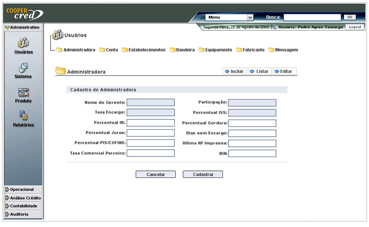 Interface de aplicativo web com a função de gerenciar cartões de crédito, avaliação de processos de análise e concessão de crédito.